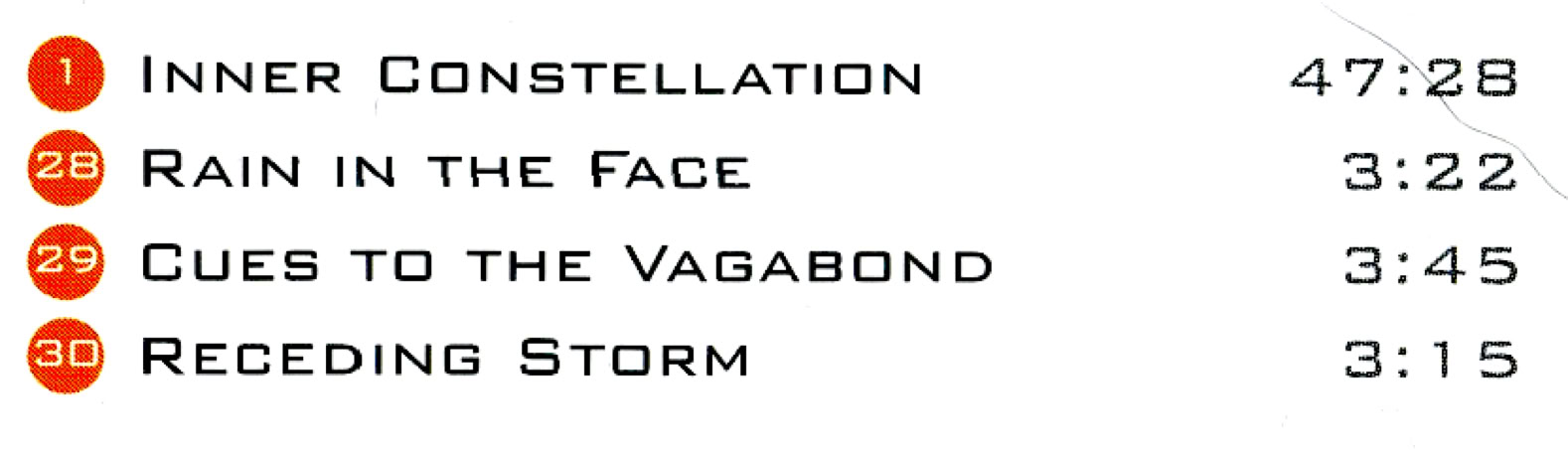 Track Listing: Inner Constellation: Autumn Light, Elastic Horizon, Enter Fresh Juicy, Three Uninvited Guests, Clinging Fire, Being Drawn, Phat on the Runway, Effigy, Totem, Mask in Profile, Triple Astra Texture, Walkabout, Transformation, Death Once Dead, No Dying Then, Dream Breath, Richter Smears, Spiral Blue, Wormhole Thief, Red Pepper Pods, Add Wings to Them, Dragonfly, Eucalyptus, Spice Enters the Groovy Night, Autumn Clouds, Burning Nest, Keeping Still Mountain, Inner Constellation, Sonic Ocean; Rain in the Face; Cues to the Vagabond; Receding Storm.