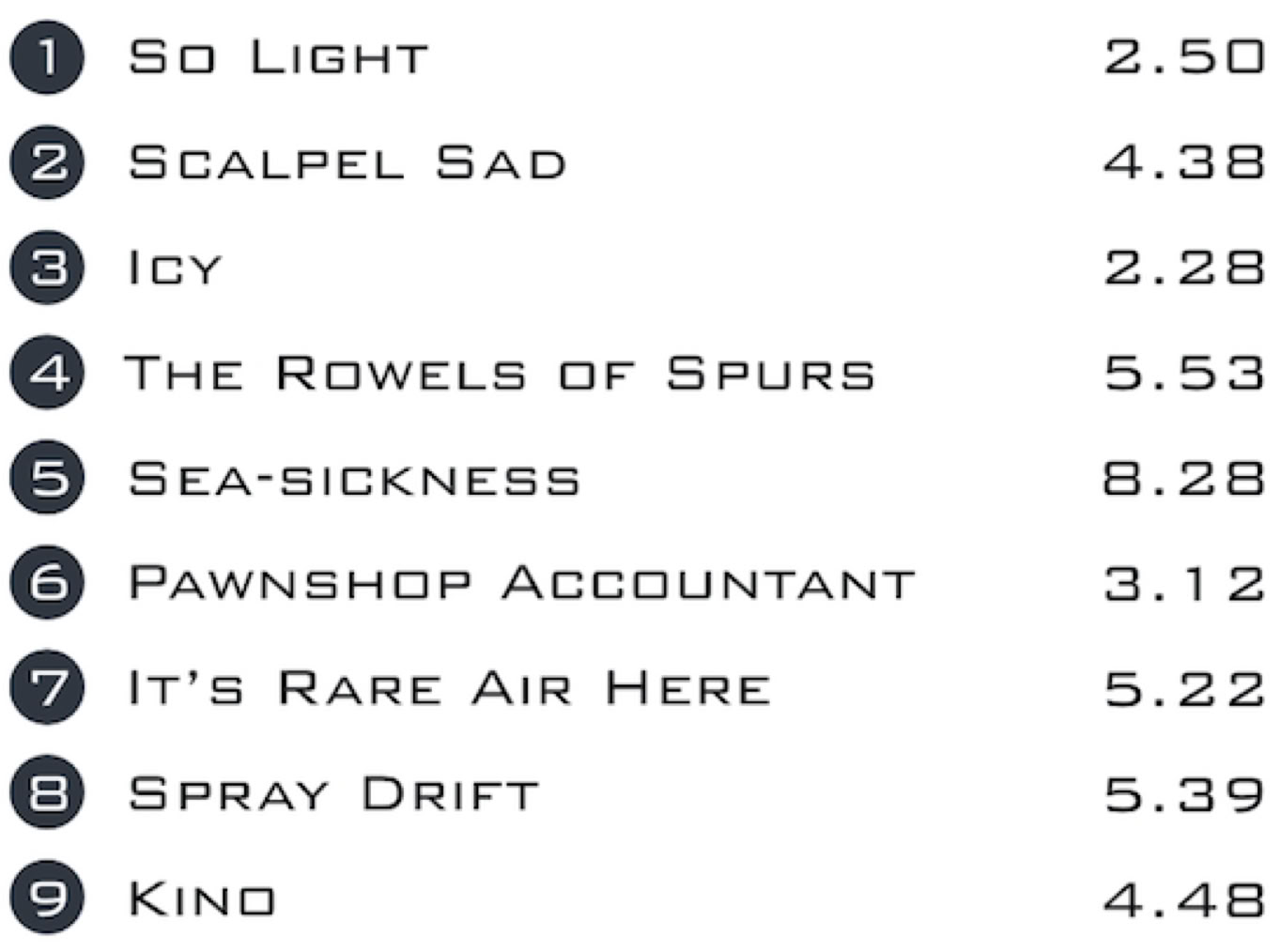 Many of Slow's compositions are very ruminative in nature. The listener can almost feel the thought processes rumbling below the surface. "Pawnshop Accountant" fits that model as does "Seasickness," and "Scalpel Sad" (a title I do not wish to think about). Chords produce single notes...which melt into the next chord...and on.