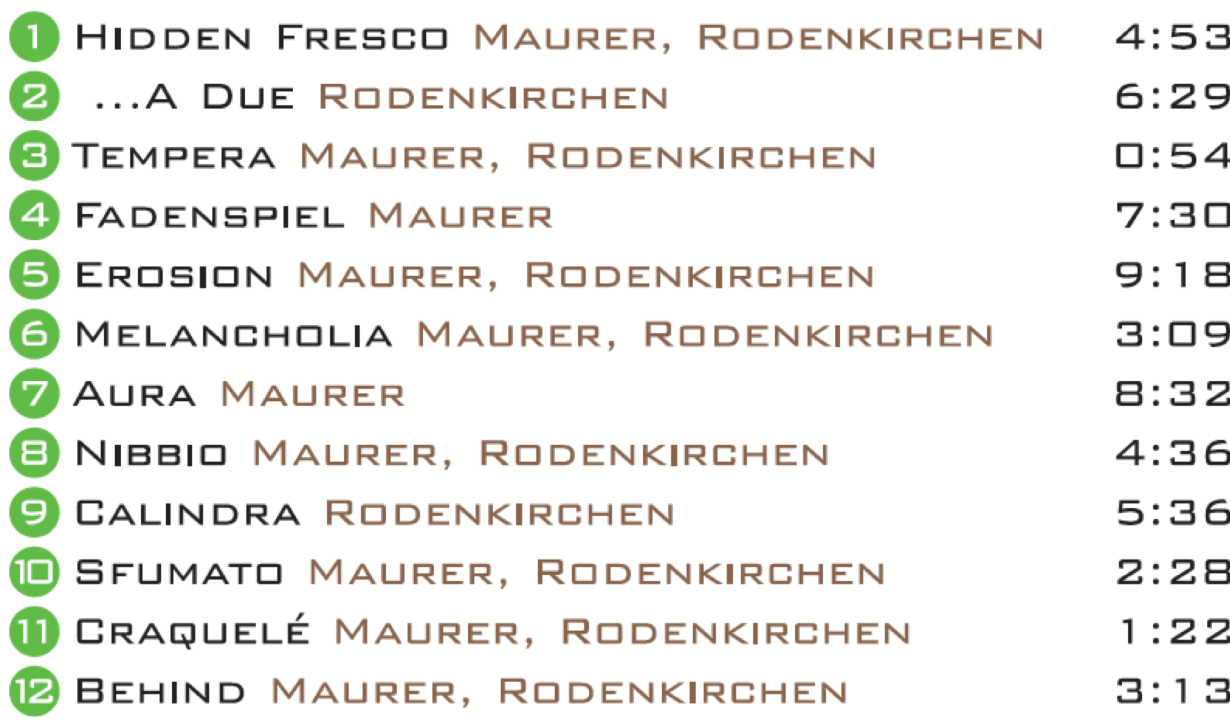 Beauty is unearthed and unabashedly displayed throughout Hidden Fresco, the latest release from the German duo of Albrecht Maurer and Norbert Rodenkirchen. Their use of medieval instruments to explore contemporary sounds cultivates a fresh perspective on modern improvisation. The warm timbre of the instrumentation softens the edge of harsh dissonance while enhancing tonal resolve. There’s a sense of urgency that permeates the entire disc. Maurer and Rodenkirchen are not intent on wasting sonic space. From the frenzied opening notes of the title track to the passionate evocation of “Behind,” the duo is unwavering in their search for musical unification. ... Maurer and Rodenkirchen are both technical masters; their incorporation of percussive effects, chords, and rapid lines portray sympathetic artists who are able to push the boundaries of archaic instrumentation to express a full range of emotion.