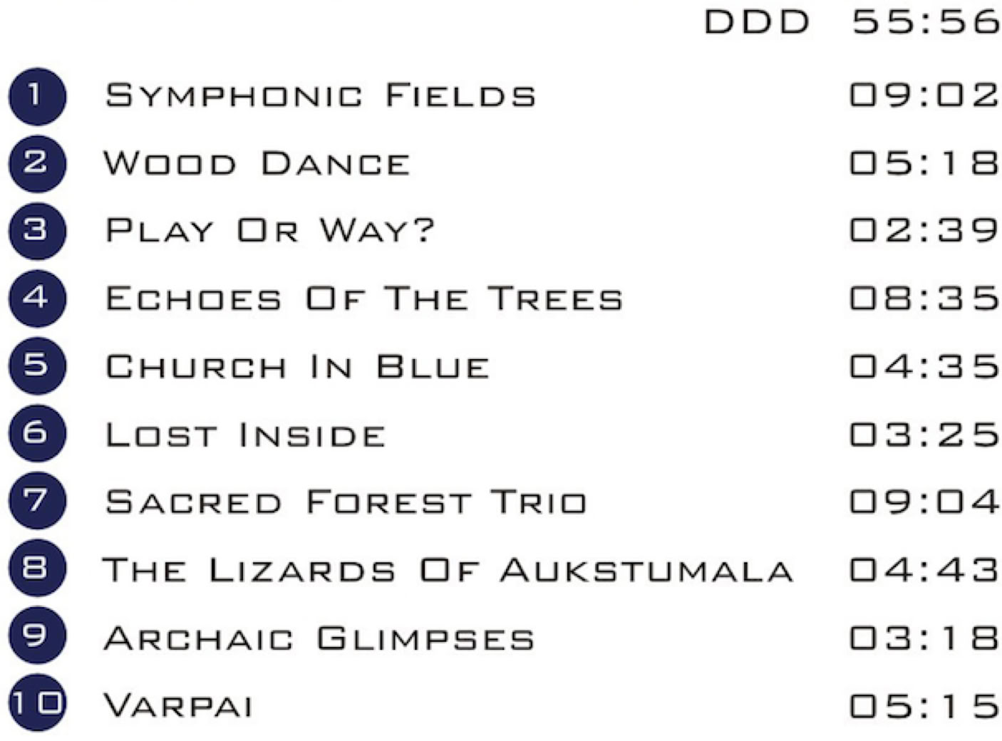 In those You will hear shimmering water, wind brushing through leaves or going through hollow tree trunks in the forrest. Those natural inspirations can be quite easily traced in the tiltles on the album - "Symphonic Fields", "Wood Dance", "Echoes of the Trees". Varpai (if Wikipedia is any help) is lithuanian for 'bells' and You will also hear a lot of those, gongs, bows on plates, archaic or ritual objects, small sounds dying slowly in the time and space. All the 'self-composed' pieces were recorded in church and this music is also very spiritual, mystic, but I would say that this spiritualism is somehow of the pagan, ancient descendance, the whole performance being some kind of celebration and sonic decodification of Mother Earth. Music that manages to be rich and full-textured and spare and light at the same time. Completely abstract, yet strangely accessible and hypnotizing (lot of Air, Water, Earth but very little Fire). Escaping the common time and space reality it is, to cite the short liner notes, "otherwordly" and "rich with a sense of timeless". While avoiding the soothing cliches of new age music, this is captivating, engaging, very unique and rewarding listening experience.