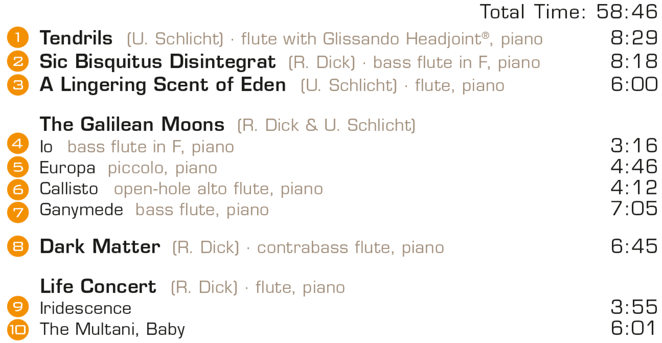 It is probably no coincidence that space imagery so frequently figures into this duo‘s album titles. The present recording, “The Galilean Moons,” is the successor to the 2005 collaboration “Photosphere,” and if you delve deeper into the catalogue, you will find Robert Dick’s “Jazz Standards On Mars,” Ursel Schlicht’s “String Theory” and “Einstein’s Dreams”, Robert’s “Third Stone from the Sun” and “Worlds of If,” the last two taken from a Jimi Hendrix song and a classic 1960‘s science fiction magazine.